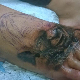Silloin ekalla kerralla kun käytiin, käytiin vain hölisemässä Matt-nimisen duden kanssa siitä että haluttaisiin tatuoinnit ja saatiin selailla Outer Limitsin artistien kirjasia ja valita mieleisemme artisti. Päädyttiin sitten molemmat portrait-tatuointeihin erikoistuneeseen Jhoniin, jolle sitten varattiin keskusteluaika seuraavaksi päiväksi. Jhonin kanssa puhuttiinkin sitten siitä että haluaisin tatuoinnin oikeaan jalkapöytääni, mihin herra rohkaisevasti totesi että se on "the most painfull spot in a human body". Nyökkäilin siinä vaan että joojoo ei mitää, kyl mä kestän. Ja tämän jälkeen alettiinkin metsästää oikeaa kuvaa, minkä haluaisin. Lopulta päädyttiin sitten varaamaan aika parin viikon päähän, minkä jälkeen lähtiin Willun kanssa himaa kohden.